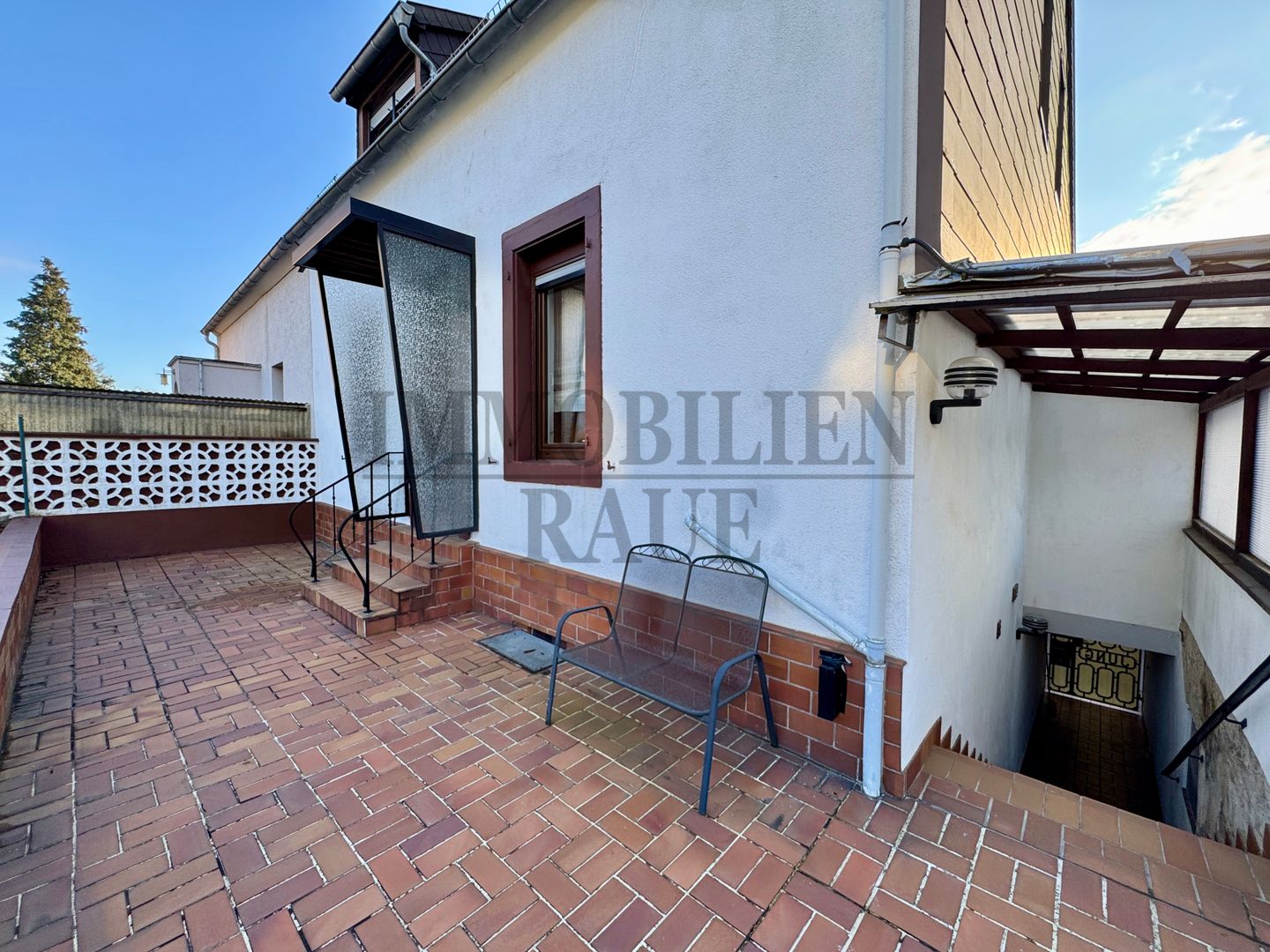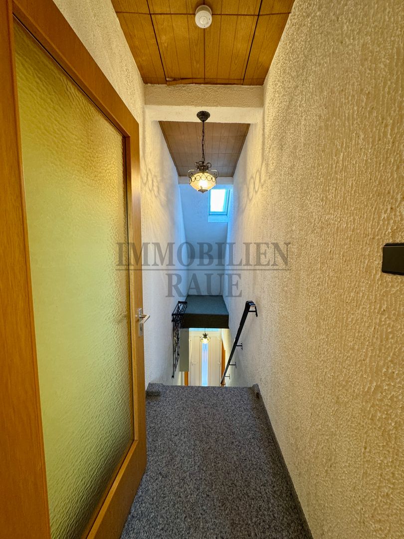 Über eine überdachte Außentreppe erreichen Sie das Obergeschoss mit einer großzügigen Küche sowie einem hellen Wohn- und Essbereich. Ein weiteres Zimmer eignet sich auch ideal zur Herstellung eines Badezimmers, die Gestaltung und Umsetzung liegt in der Verantwortung des Käufers. Von hier aus gelangen Sie auf die große Terrasse, die sich über der Garage befindet, sowie in den kleinen, pflegeleichten Garten. Die Wohnfläche beträgt ca. 62 m².