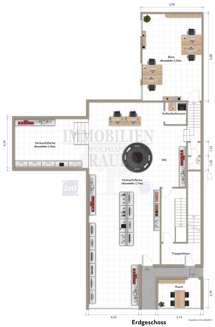 Die Schaufensterfläche (an der Straße) des einladenden Verkaufsraumes beträgt ca. 8 Meter.
