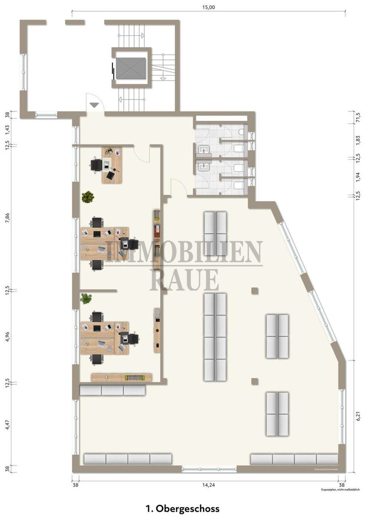 Die angebotenen Einheiten befinden sich im rechten Gebäudetrakt im 1. und 2. Obergeschoss und verfügen jeweils über ca. 225 m². Die Flächen können separat oder gemeinsam angemietet werden und eignen sich ideal für Unternehmen aus den Bereichen Verwaltung, Dienstleistung, Beratung oder Praxisbetrieb.