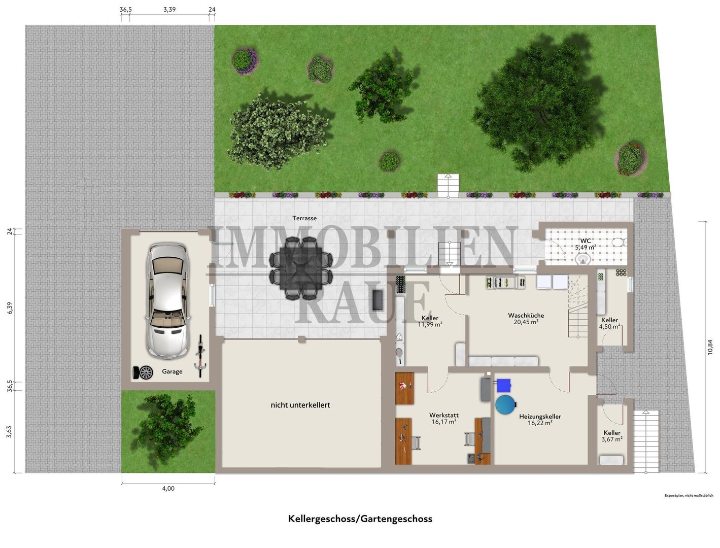 Hier befinden sich eine praktische Waschküche, mehrere Kellerräume sowie ein Heizungsraum und eine Werkstatt. Ein direkter Zugang in den Garten sorgt für zusätzlichen Komfort. Vom Garten gelagt man auch zu einem "Garten-WC" im Haus.
